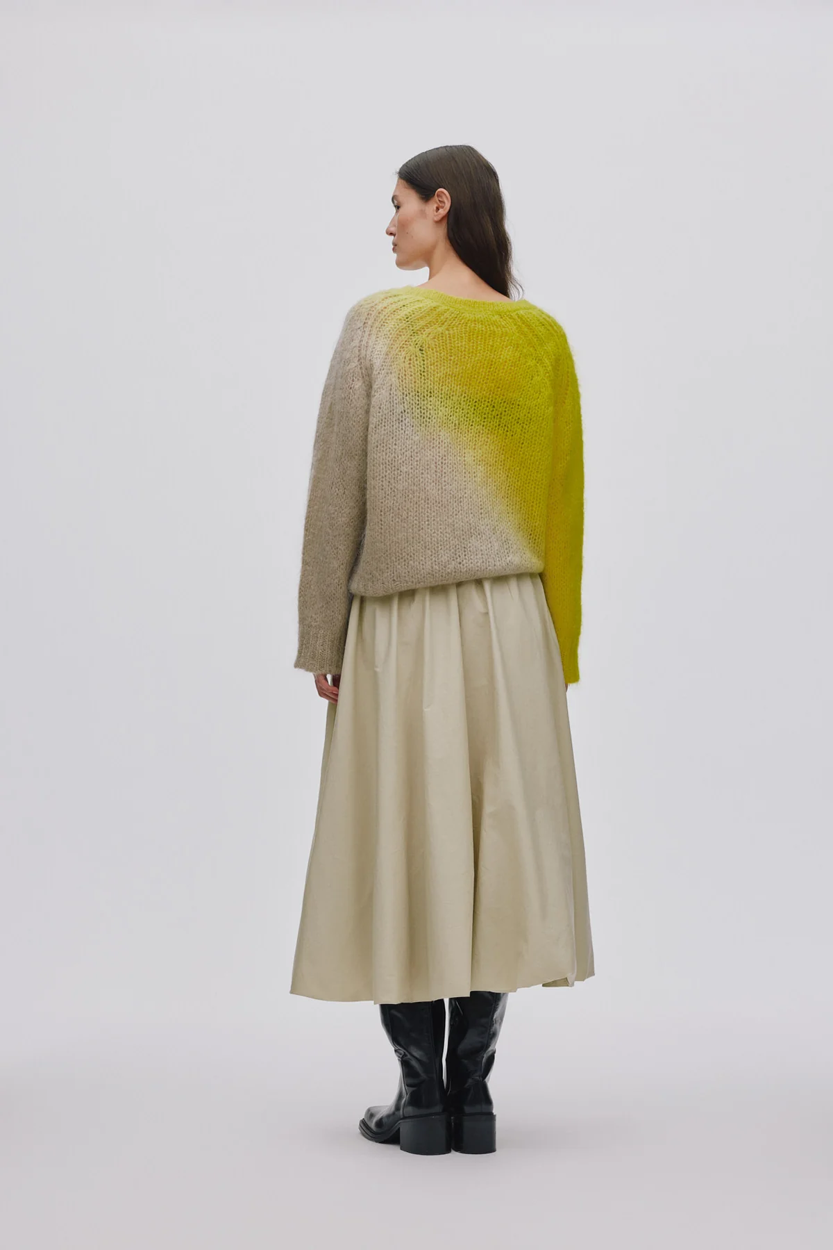 Das leuchtenden Farbspiel Lime Yellow oder Vibrant Green im Kontrast zum ruhigen Beige verleiht dem Pullover eine ausdrucksstarke, moderne Wirkung.
